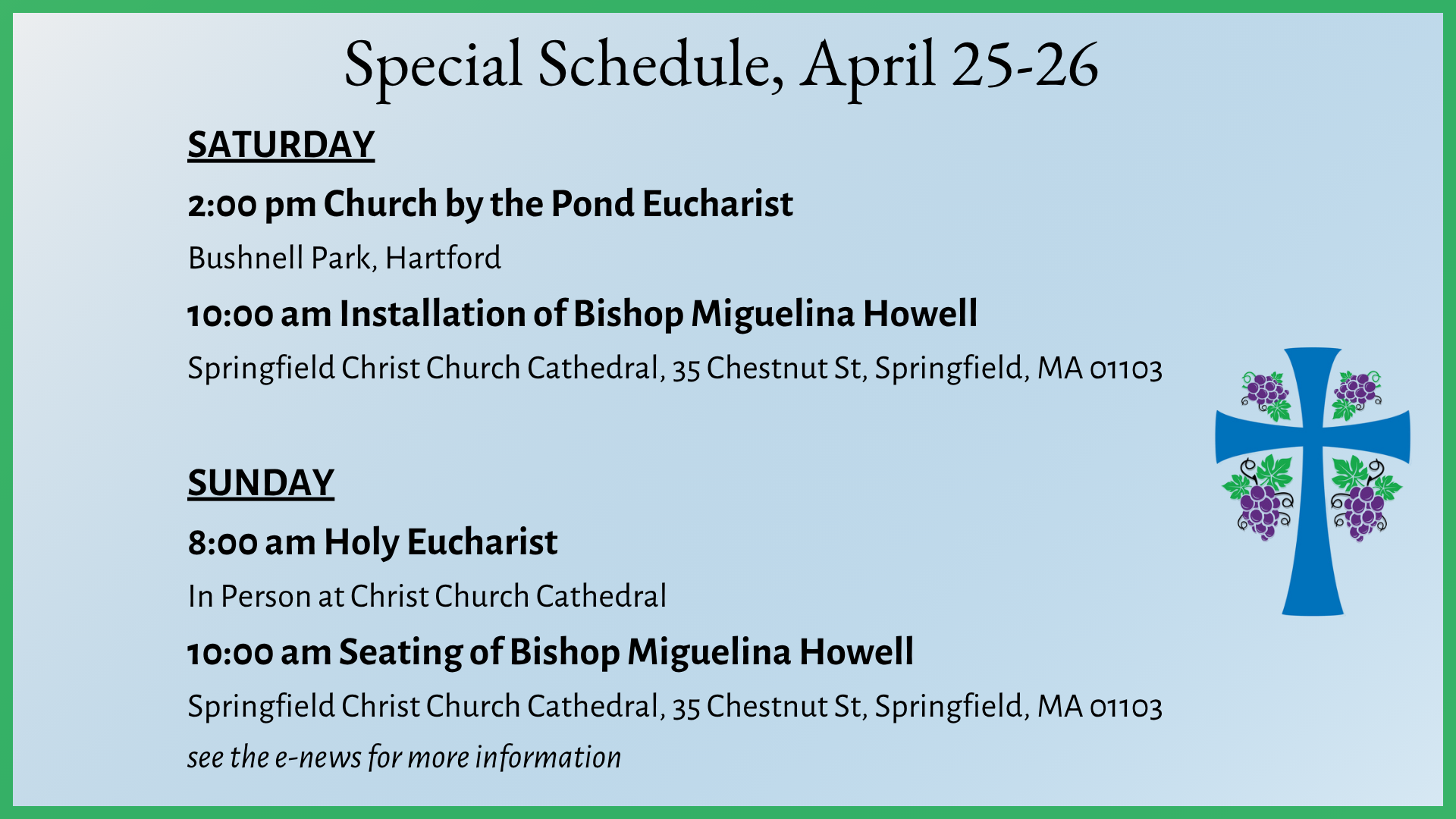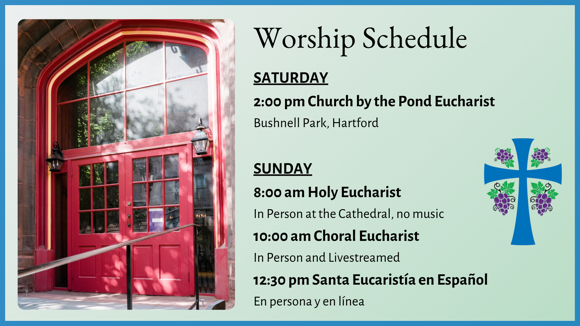 2:00 p.m. Church by the Pond Eucharist, Bushnell Park, Hartford - In Person.